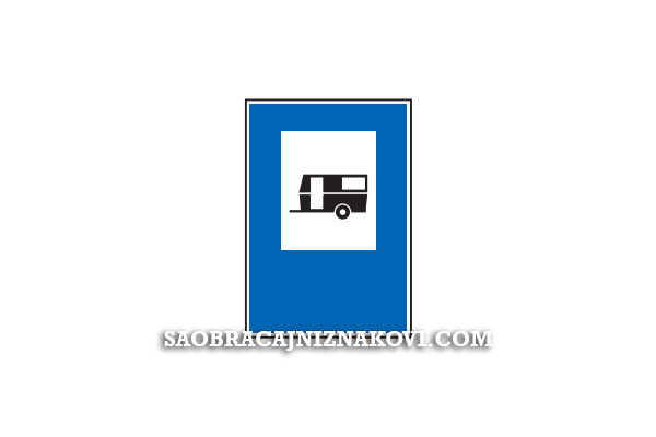 Znak "Teren za kampovanje u prikolicama" označava blizinu terena ili teren za kampovanje u prikolicama.