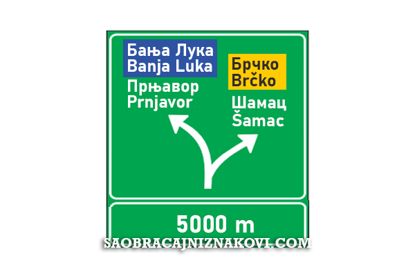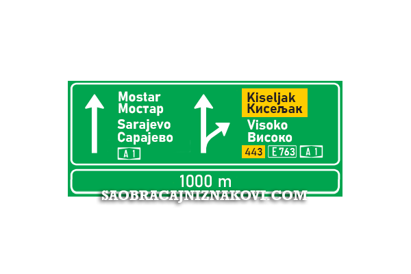 Znak "Predputokazna ploča" Znak označava ime izlaza ili izdvajanje na autoputu i putevima sa raskrsnicama u više nivoa. Može biti postavljena sa desne strane kolovoza, ili na portalu iznad kolovoza.