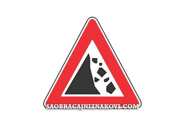 Znak "Odronjavanje kamenja" sa desne strane puta, ili sa lijeve strane, označava blizinu dijela puta na kome postoji opasnost od kamenja koje pada ili od kamenja koje se nalazi na putu.