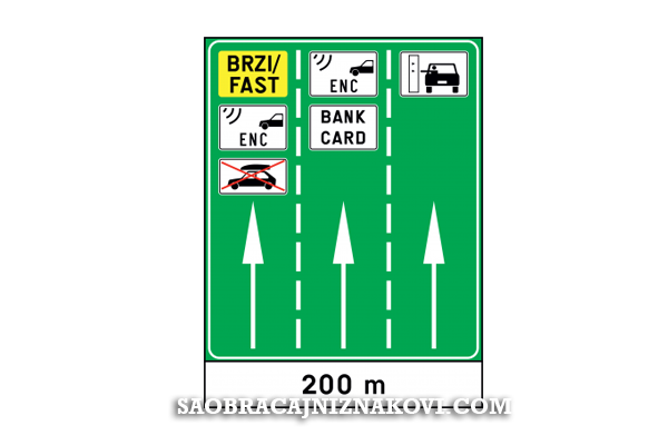 Znak "Prestrojavanje vozila ispred objekta naplate cestarine" označava mjesto prestrojavanja vozila ispred objekta naplate cestarine prema načinu naplate cestarine.
