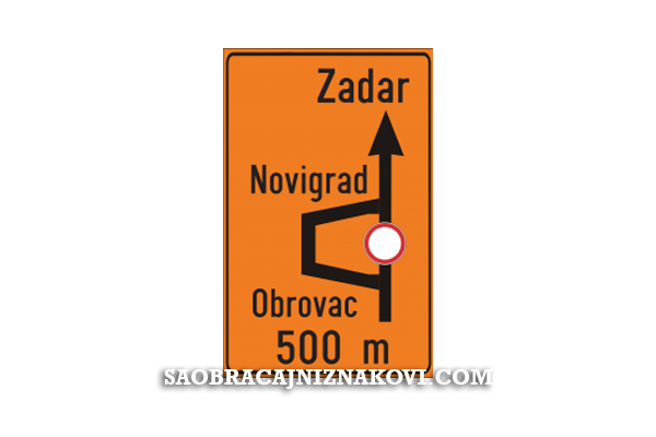 Znak "Predznak za obilazak" označava pravac i smjer obilaska preko naseljenog mjesta.