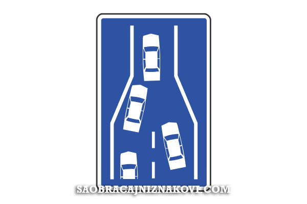 Znak "Naizmenično uključivanje vozila" označava mesto gde se, zbog završavanja saobraćajne trake, suženja kolovoza, odnosno smanjenja broja saobraćajnih traka, vozila naizmenično uključuju u jednu saobraćajnu traku.