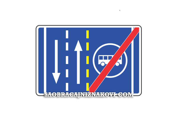 Znak "Završetak saobraćajne trake za vozila javnog prevoza putnika" označava mesto na kome se završava saobraćajna traka namenjena samo za kretanje vozila javnog prevoza putnika.