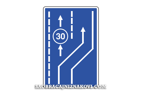 Znak "Saobraćajna traka za spora vozila" označava početak saobraćajne trake kojom se moraju kretati vozila koja se kreću brzinom (km/h) manjom od brzine (km/h) označene na znaku.