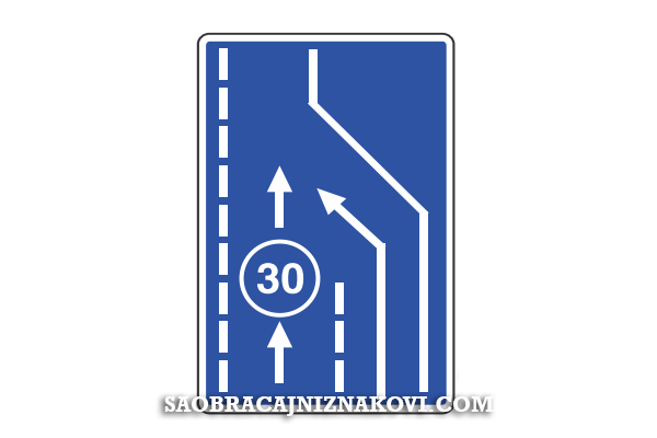 Znak "Završetak saobraćajne trake za spora vozila" označava mesto na kome se završava traka kojom se moraju kretati vozila koja se kreću brzinom (km/h) manjom od brzine (km/h) označene na znaku.